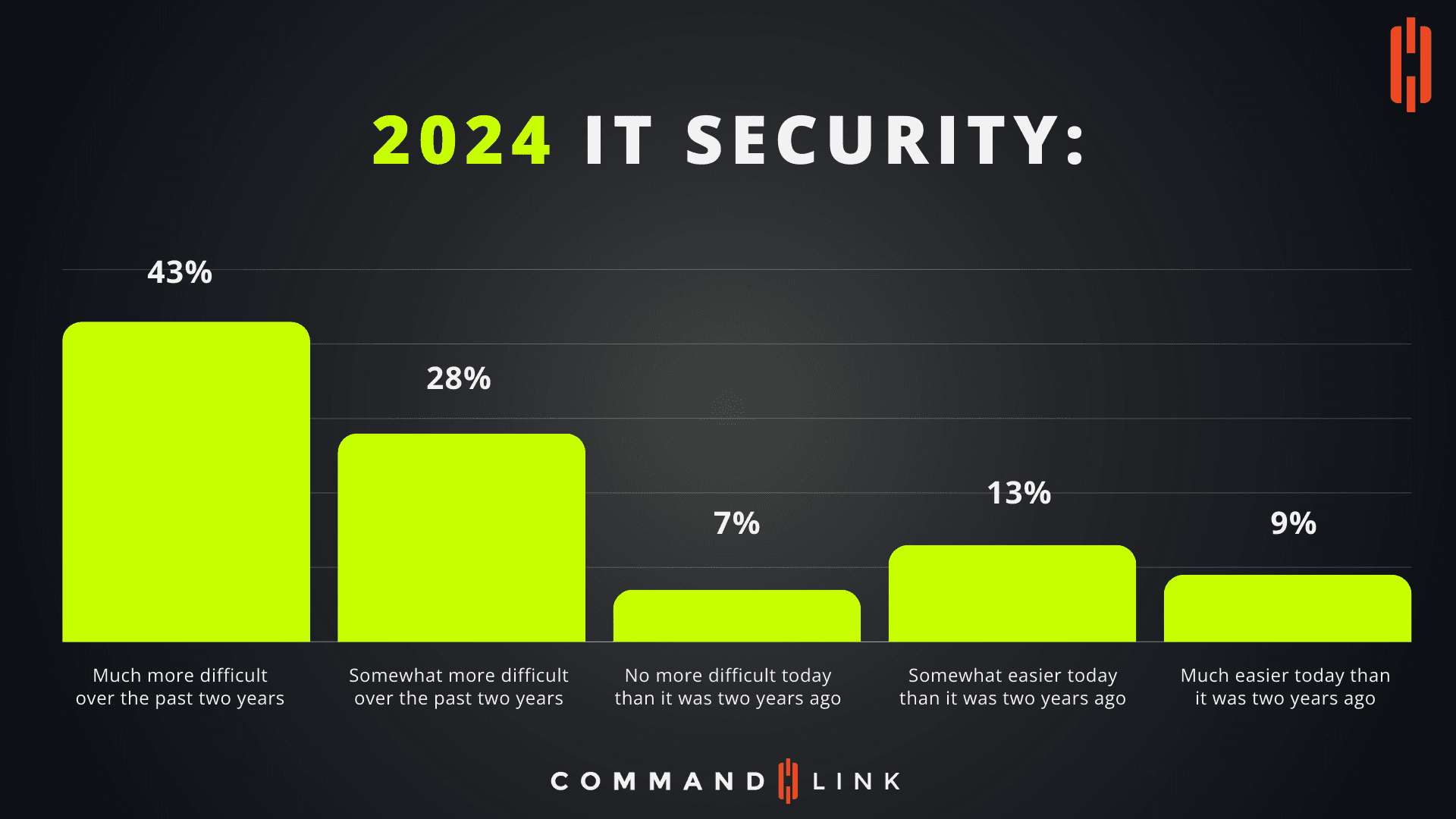 Another 28% of respondents feel that IT security has become "somewhat more difficult." This group likely acknowledges the increased challenges but may feel that these challenges are manageable with the right resources and strategies. This sentiment might be driven by: