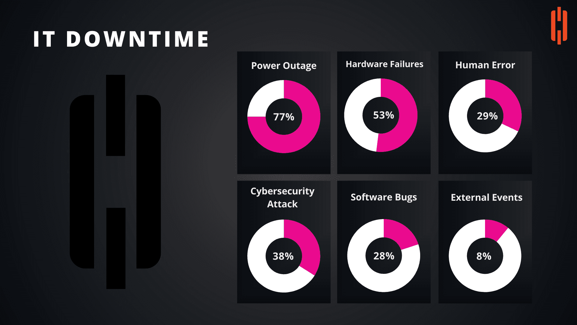 Impact: Hardware failures, such as malfunctioning servers, storage devices, or network equipment, account for 53% of IT downtime incidents. These failures can lead to prolonged outages and significant data loss if not addressed quickly.