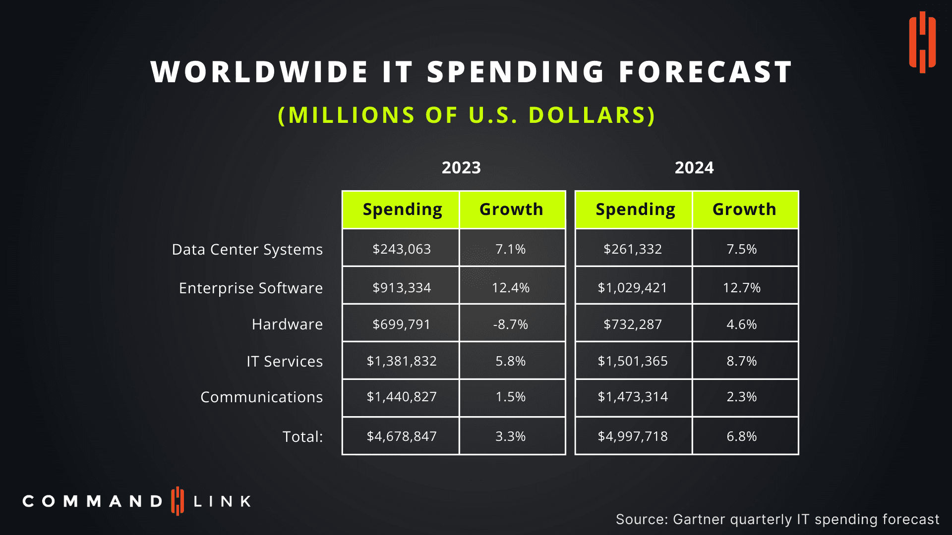 The worldwide IT spending forecast for 2024 highlights the critical role that technology investments play in driving business growth, innovation, and resilience. As organizations navigate the challenges and opportunities of the digital age, strategic investments in data center systems, enterprise software, hardware, IT services, and communications will be essential to their success.