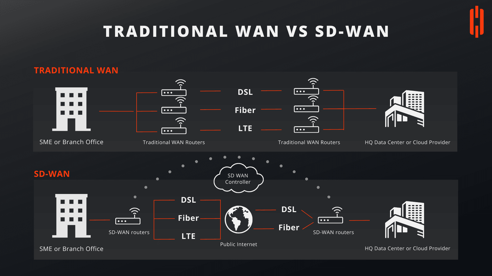 As organizations continue to evolve and expand their networks, the demand for more efficient, flexible, and cost-effective networking solutions has grown. This has led to the adoption of Software-Defined Wide Area Networking (SD-WAN) as a modern alternative to traditional WAN (Wide Area Network) architectures. The image above compares these two networking approaches, highlighting key differences and advantages of SD-WAN over traditional WAN.