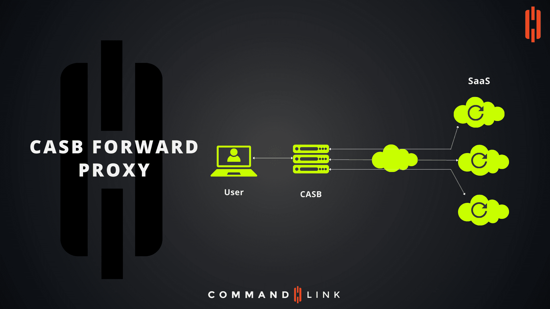 CASB: Positioned between the user and the cloud, the CASB in forward proxy mode intercepts the outbound traffic from the user. The CASB applies security policies such as encryption, data loss prevention, malware detection, and compliance checks before allowing the traffic to proceed to the cloud service.